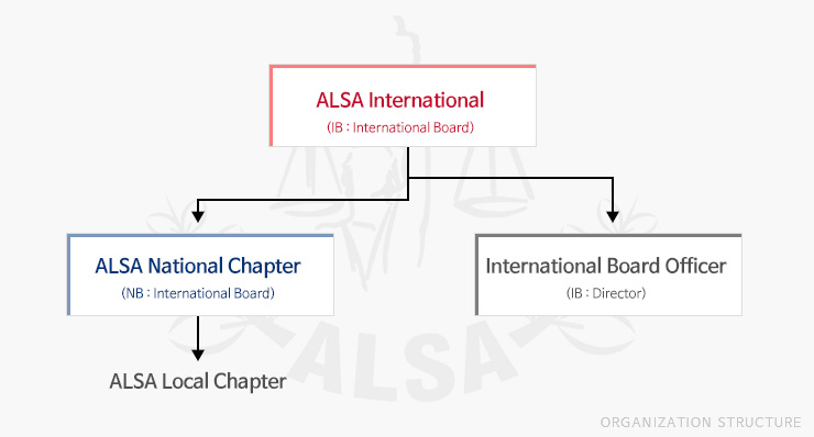 ALSA InternationalÀº ALSAÀüü¸¦ ÃÑĪÇϸç, ALSA InternationalÀÇ ÀÓ¿øÀº Governing Council·Î IB (International Board)¿Í °¢ National ChapterÀÇ ´ëÇ¥µé·Î ±¸¼ºµË´Ï´Ù.