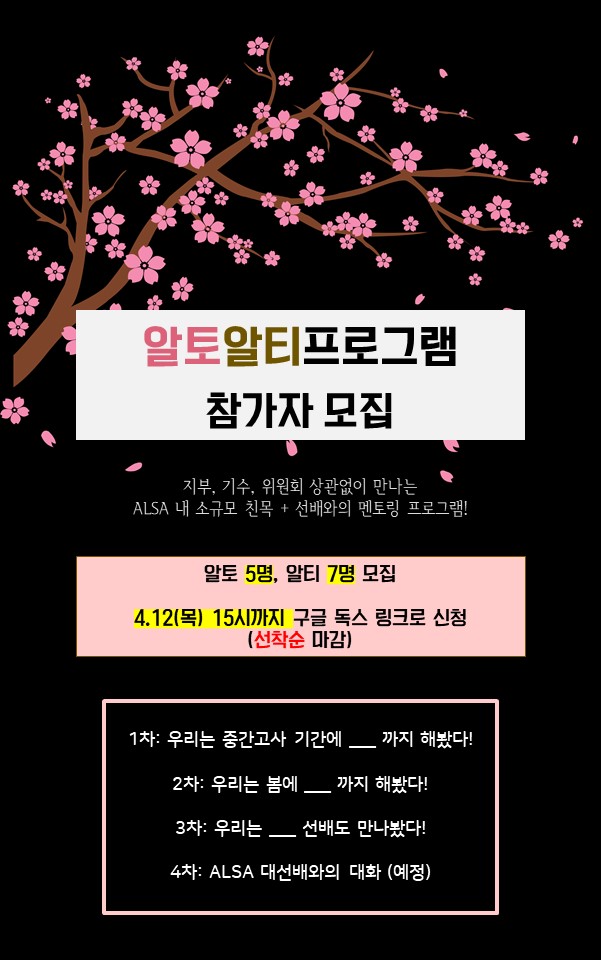 '¾ËÅä¾ËƼÇÁ·Î±×·¥'Àº ALSA KOREA ³»ÀÇ ¼Ò±Ô¸ð Ä£¸ñ ¹× ¼±¹è¿ÍÀÇ ¸àÅ丵ÇÁ·Î±×·¥À¸·Î, ±âÁ¸ ±â¼ö¿Í ½ÅÀÔ ±â¼ö°¡ ¦°ú Á¶¸¦ ÀÌ·ç¾î Ȱµ¿ÇÕ´Ï´Ù. À̹øÇбâ´Â µ¿Ã¢È¸¿ø ¼±¹èµé°ú ÇÔ²²ÇÏ´Â ½Ã°£À» ¸¶·ÃÇÒ ¿¹Á¤ÀÔ´Ï´Ù.